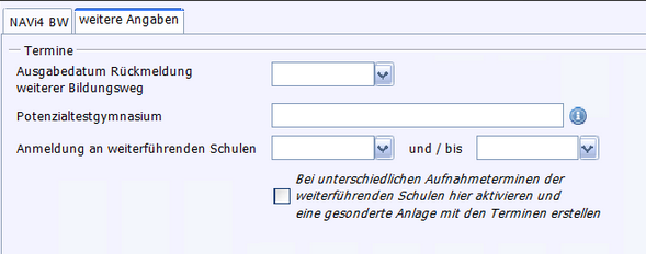 2.1 Vorarbeiten: Grundlagen ASV (relevant für NAVi 4 BW) Die Anschriften der Erziehungsberechtigten müssen sorgfältig gepflegt sein in Bezug auf: Hintergrund: Die Formulare werden nur dann mit den richtigen Angaben gefüllt, wenn die entsprechenden Felder richtig befüllt sind. Beispiel: •Die Formulare werden an beide Erziehungsberechtigten gerichtet, wenn beide Erziehungsberechtigten wie Schüler wohnen und auskunftsberechtigt und im Schriftverkehrverteiler sind. •Bei getrennt lebenden Elternteilen wird ein zusätzliches Informationsschreiben für den getrennt lebenden Erziehungsberechtigten erstellt, wenn ein Erziehungsberechtigter wie Schüler wohnt und der andere Erziehungsberechtigte eine eigene Adresse besitzt. Beide Erziehungsberechtigte müssen auskunftsberechtigt und im Schriftverkehrverteiler sein. 2.2 Vorarbeiten zu NAVi 4 BW in ASV-BW Tragen Sie die Termine sowie das Potenzialtestgymnasium zu NAVi 4 BW unter Datei > Schüler > NAVi4 BW/ Schullaufbahnempfehlung - Reiter Weitere Angaben ein. |